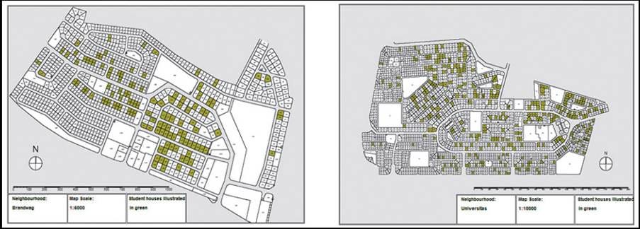 Talle studies is al gedoen oor die impak van “studentifikasie” op die karakter en leefstyl van hierdie buurte, maar die politieke implikasies daarvan het nog weinig aandag gekry. Om die uitwerking van “studentifikasie” op die politiek te illustreer, gaan ek spesifiek na twee voorstede in Bloemfontein kyk: Brandwag en Universitas. Albei buurte is naby aan die Universiteit van die Vrystaat en die Sentrale Universiteit van Tegnologie geleë. Hul gunstige ligging vir studente het meegebring dat daar 'n ekonomiese aansporing was om voormalige enkelfamilie-huise in hierdie buurte na studentehuise te omskep. Nou woon tot tien studente in 'n enkele huis. Hieronder kan 'n mens sien watter voorstede langs die universiteit lê.