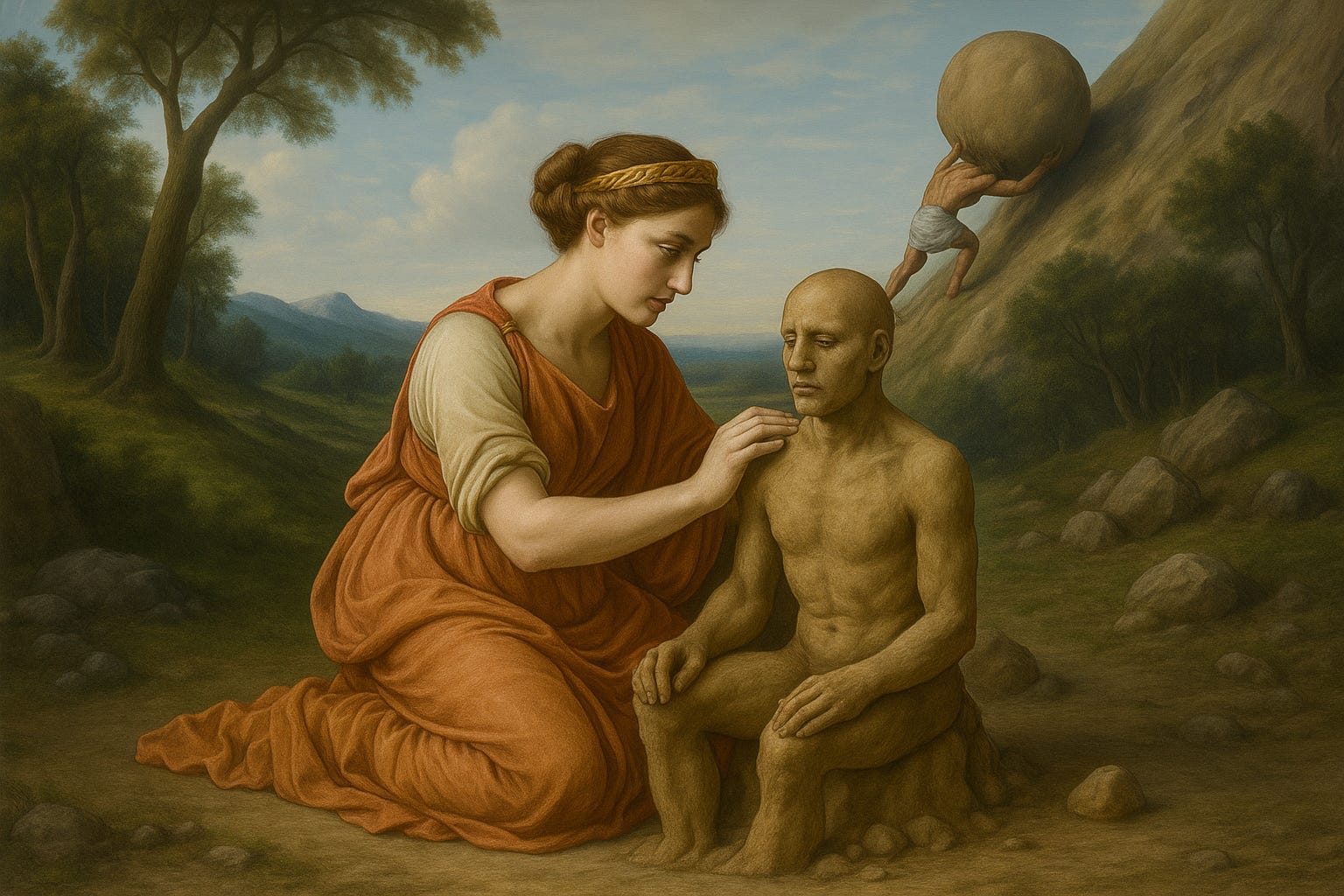 Albert Camus skryf in sy bekende essay oor die mite van Sisyfos (wat verdoem is om elke dag 'n klip teen 'n heuwel uit te rol) dat hy gelukkig is om sy straf uit te dien. Wat Camus na my mening nie na behore verreken nie, is die rede vir Sisyfos se straf, naamlik dat hy die dood (Thanatos) vasgeboei het, en mense gevolglik van hulle dood ontneem het. Daarmee saam is die mens ook ontneem van die sorgsame bestaan, oftewel die koestering van die lewe.