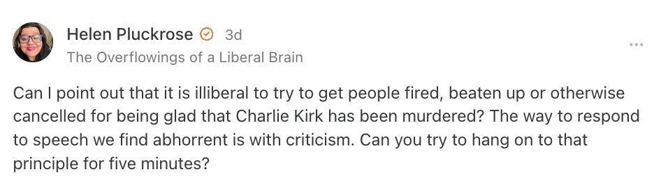Daar is mense wat sal aanvoer dat ek 'n belangrike onderskeid miskyk tussen wetlike strawwe, en maatskaplike afkeuring of gevolge vir 'n spreker se professionele lewe. Ons behoort 'n baie hoë maatstaf te hê in die regsbeginsels wat mense vir uitdrukking straf, maar sekerlik kan burgers hul eie oordele maak oor wat moreel aanvaarbaar is en dit weerspieël deur maatskaplike afkeur? Lucy Connolly, as 'n kinderoppasser, kon regmatig kliënte verloor omdat ouers besluit het om nie hul kinders by iemand te los wat skunbaar fantaseer oor om mense lewend te verbrand nie. Dit sou 'n volkome liberale uitoefening van assosiasievryheid wees. Net so moet werkgewers vry wees om 'n eties gefundeerde, beredeneerde beoordeling te maak dat mense wat politieke geweld vier, 'n risiko vir die veiligheid van die personeel of kliënte, of vir die reputasie van die maatskappy inhou — sonder dat hulle daarvan beskuldig word dat hulle aan kanselleerkultuur deelneem.