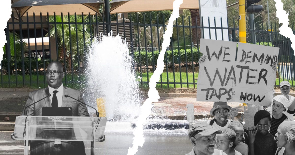 Laasgenoemde se verouderde en verwaarloosde infrastruktuur, groeiende bevolking en munisipale wanbestuur het tot 'n perverse situasie gelei waar mense in die reën stort en nie in hul badkamers in Brixton, Roodepoort, Melville en dele van Ekurhuleni nie. Wanneer watertenks vir sindikate 'n bron van inkomste word en die owerhede hulle nie kan of wil stop nie (weens vrees of samespanning) is daar min aansporing om die waterprobleme op te los – ondanks die katastrofale gevolge vir inwoners en besighede.