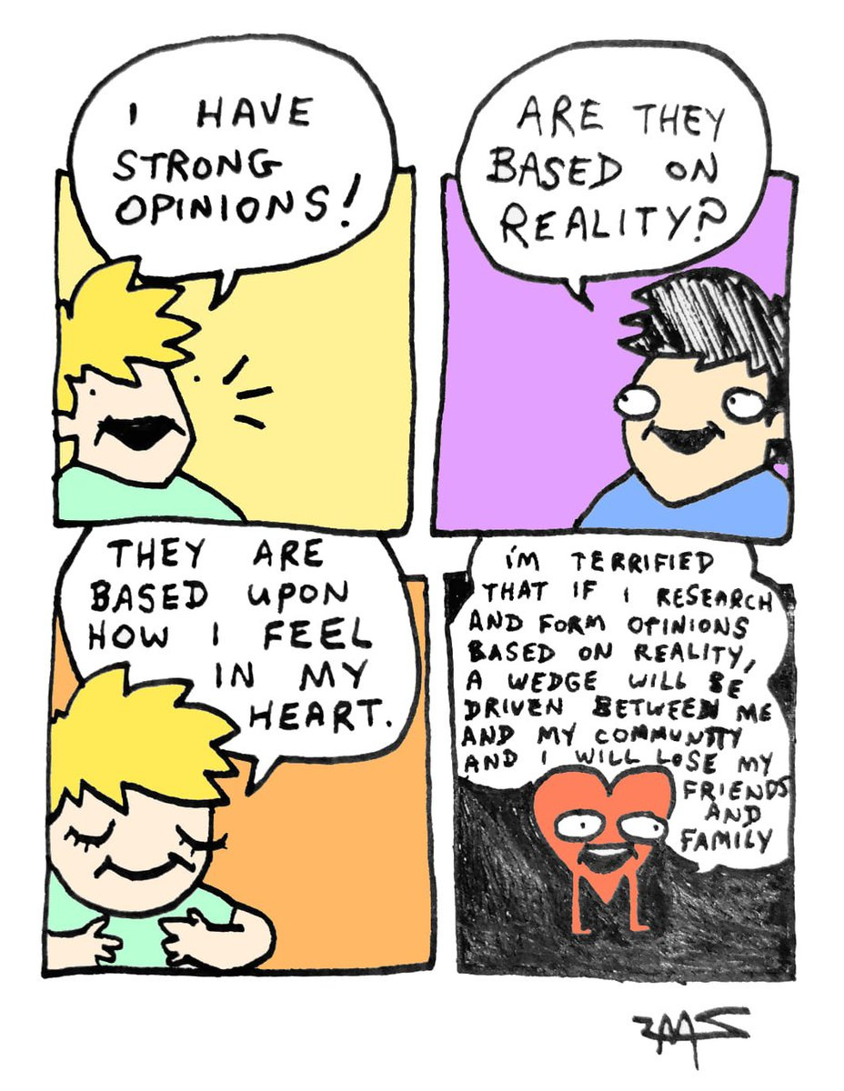 Die feit dat hierdie uiteenlopende standpunte so saamgebondel is, voel tipies vir ons natuurlik. Vir dié wat omgee oor politiek, is hulle kant die goeie kant wat teen 'n misleide of kwaadwillige politieke opposisie veg. Om aan die goeie kant te wees beteken om reg te wees oor al hierdie uiteenlopende kwessies.