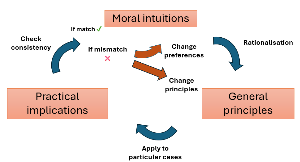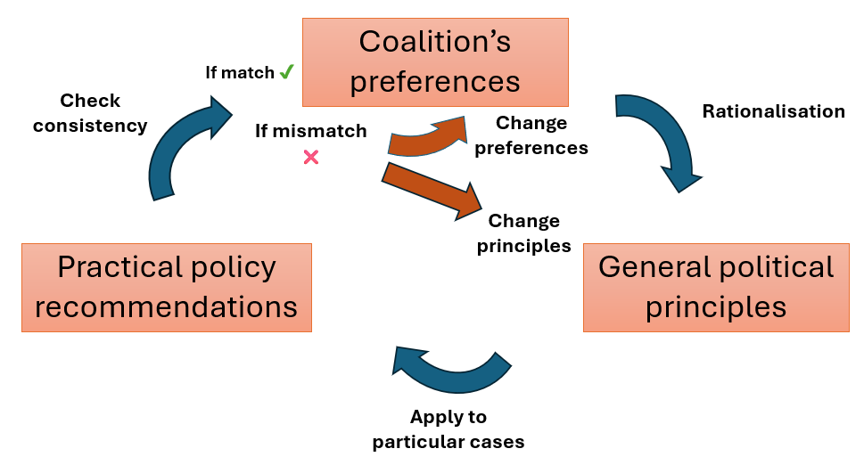 Omdat ons streef na só 'n ooreenkoms oor konsekwente beginsels, kom die beginsels nie eerste nie. Hulle moet ons voorkeure weerspieël. Maar aangesien ons voorkeure teenstrydighede kan bevat, mag dit nodig wees om óf ons voorgestelde beginsels aan te pas, óf op sekere voorkeure kompromieë aan te gaan. Dit bied 'n realistiese regverdiging vir 'n proses wat Rawls hoofsaaklik voorgestel het as 'n wenslike metode om 'n morele sisteem te vorm.