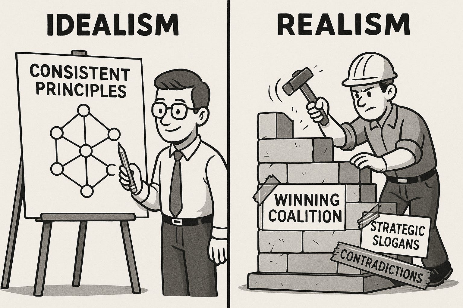 Vir enige koalisie wat na magsverkryging strewe, bestaan daar altyd 'n spanning tussen pragmatisme (om ideologiese kompromieë aan te gaan ten einde 'n wenkoalisie te bou) en ideologiese konsekwentheid (om slegs nuwe standpunte te aanvaar wat met bestaande beginsels versoenbaar is). Aangesien oorlewing in die politiek afhang van die vermoë om 'n groot koalisie saam te stel, triomfeer pragmatisme dikwels. Dit is waarom die ideologieë van koalisies gewoonlik nie konsekwent is nie en gevorm word deur 'n geskiedkundig gevalverbondelike oftewel kontingente samestelling van sosiale groepe. By enige gegewe politieke kwessie kan daar dus 'n botsing wees tussen sommige van die koalisie se verkondigde beginsels en sy voorkeur-standpunt in die praktyk.