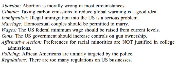 Die lys van politieke standpunte is saamgestel deur die filosoof Simon Cullen (2018), wat ook 'n opname gedoen het waarin hy die korrelasie tussen antwoorde onder Amerikaanse respondente aangetoon het.