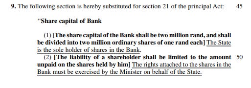 Die wetsontwerp skrap sleutelaspekte van die huidige Reserwebankwet. Dit sluit omskrywings soos “aandeelhouer” en “verkose direkteur” in wat verdwyn, terwyl die mag om direksielede aan te stel en selfs ouditeure te benoem, regstreeks in die hande van die tersaaklike minister beland. Die rede vir hierdie verskuiwing, volgens die wetsontwerp, is eenvoudig: om die staat die enigste aandeelhouer van die bank te maak en sodoende "demokratiese beheer" oor die bank te verseker. Dit maak meer sin om dit sommer hier te plak: