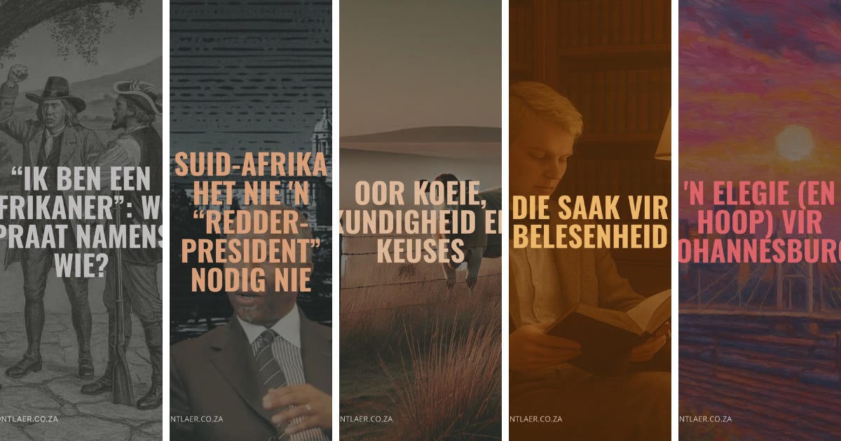 Dit is moeilik om slegs vyf artikels in 'n publikasie vir verdere bespreking uit te sonder terwyl daar soveel goeies in 2025 was. Terwyl ander om verskeie redes – soos besondere en kreatiewe taalgebruik, sterk menings, die ontlokking van debat en fyn redenasies – ook my lys kon haal, het ek in my eie subjektiwiteit die volgende vyf gekies. Hulle raak sterk temas aan wat my op uiteenlopende grondslae aangegryp het en verdere besinning vereis.